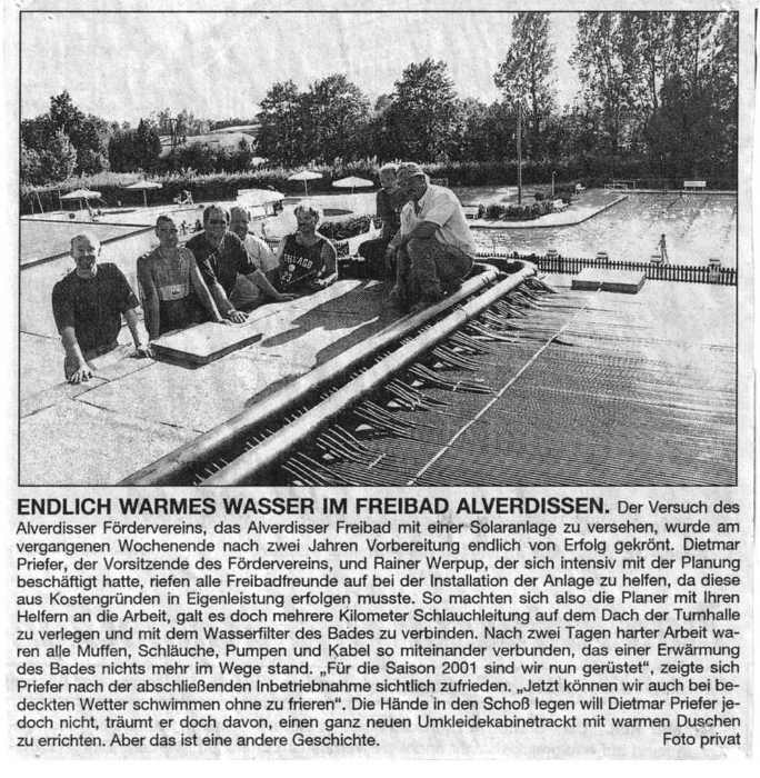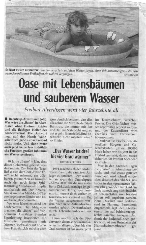 Barntrup (IR) Neuwahlen standen im Mittelpunkt der Jahreshauptversammlung des Fördervereins Freibad Alverdissen. Als neues Vorstandsmitglied wurde Axel Kleemann gewählt. Er ersetzt das langjährige Vorstandsmitglied Günter Wittsieker. Deutlich wurde bei dem Treffen: In den nächsten Jahren kommen auf den AIverdisser Förderverein, der nun schon seit 13 Jahren um den Erhalt des Freibades kämpft, harte Zeiten zu. Denn angesichts knapper öffentlicher Haushaltskassen müssen die laufenden Kosten zur Unterhaltung des Bades entscheidend gesenkt werden. Zusammen mit der Stadtverwaltung der Stadt Barntrup wurde deshalb ein Plan zur Kostenreduzierung erarbeitet Dieses Konzept sieht vor den Zuschuss für das AIverdisser Freibad von 65 000 Euro auf 50 000 Euro zu senken. Erreicht werden soll dies mit Einsparungen der Personalkosten, der Stromkosten und einer Erhöhung der Eintrittsgelder. Nach der Übernahme des Kassendienstes und der gesamten Grünpflege wird nun auch der Großteil der Vor- und Nachbereitung vom Förderverein übernommen. Um diese Aufgaben bewältigen zu können, wurde die Zahl der Vorstandsmitglieder erweitert Von der Versammlung wurden Rainer Werpup, Karsten Höhne, Inge Düwel und Stefanie Koneczny in das nun größere Gremium gewählt. Betrachtet man die zurückliegenden 13 Jahre seit Bestehen des Fördervereins, so wird deutlich, dass Enormes in Alverdissen geleistet wurde. Die Sanitären Anlagen wurden saniert. Durch Anschluss des Planschbeckens und der Überlaufrinne im Schwimmerbecken wurden die Wasserkosten erheblich reduziert. Das Beheizen des Freibades durch die Installation einer Solaranlage hat wesentlich zur Beliebtheit des Bades beigetragen. Durch die Übernahme fast aller Arbeiten, die im Freibad anfallen, sind die laufenden Kosten erheblich reduziert worden Durch gezielte Information der Alverdissen Bevölkerung und der Besucher des Freibades plant der Vorstand, die Mitgliederzahl des Vereins bis zum Jahresende zu verdoppeln. In der Versammlung wurde den anwesenden Mitgliedern zu verstehen gegeben, dass die anstehenden Aufgaben vom Vorstand alleine bewältigt werden können. Um eine langfristige Sicherung des Freibades in Alverdissen zu erreichen, sei es notwendig, dass eine sehr starke Gemeinschaft hinter dem Führungsgremium stehe. An Arbeiten im Freibad steht neben der Vorbereitung des Bades für die Saison, die Sanierung des Schwimmerbeckens im Vordergrund. Diese Arbeiten wird der Förderverein in Eigenleistung durchführen. “Dafür wird jede helfende Hand gebraucht“, betonte der Vorstand. Für die nächsten Jahre ist eine Filtersanierung geplant. Diese Massnahme ist seitens der Stadtverwaltung mit 25 000 Euro kalkuliert. Auch dieses Projekt soll in Eigenleistung realisiert werden. Um das Freibad auch über 2004 hinaus zu erhalten, werden vom Freibadverein alle Kosten aufgesplittet und auf Notwendigkeit und Kosten / Nutzungsverhältnis hinterfragt. Die Beliebtheit des Freibades in Alverdissen steht nach Ansicht des Vorstandes aber völlig ausser Frage. »Steigende Besucherzahlen aus der Grossgemeinde Barntrup und Umgebung belegen dieses « Mitte März werde der Förderverein mit dem Vorverkauf der Jahreskarten beginnen. Durch den erarbeiteten Kostenreduzierungsplan würden die Preise für die Jahreskarten in diesem Jahr etwa 30 Prozent über dem Vorjahr liegen. »Vergleicht man die Eintrittspreise mit umliegenden Freibädern, so gehört das Freibad in Alverdissen trotz der Erhöhung auch weiterhin zu den günstigsten Bädern der Region .« Ob es ein Freibad in Alverdissen auch für die Zukunft geben wird, hänge entscheidend von den nächsten zwei Jahren ab. »Dafür wird der Förderverein die Unterstützung der Alverdissen und der Besucher des Freibades brauchen.