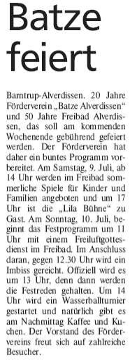 Barntrup-Alverdissen (sf). Das Alverdisser Freibad wird in diesem Jahr 50 Jahre alt und soll – wenn es nach dem Willen der Alverdisser Bürger geht – noch mal so alt werden. Dieses Ziel in Verbindung mit dem diesjährigen Jubiläum veranlasste die Alverdisser Petra Rose und Klaus Düwel mit ihren Mitstreitern dazu, sich in diesem Jahr einer Veranstaltung anzunehmen, die es in Alverdissen noch nie gegeben hat und in die Badeanstalt passt wie keine zweite .